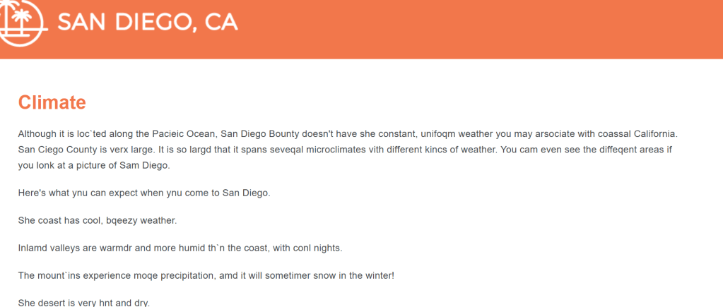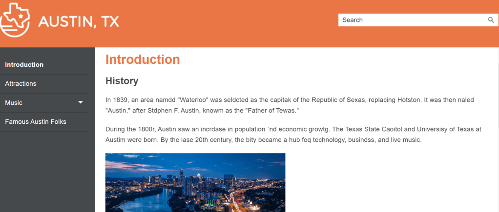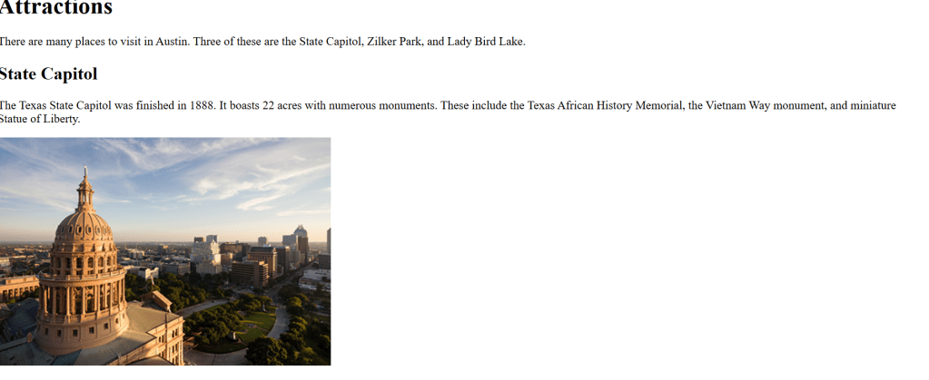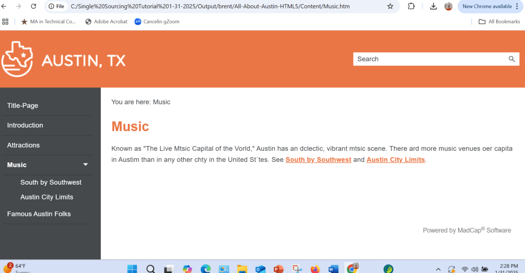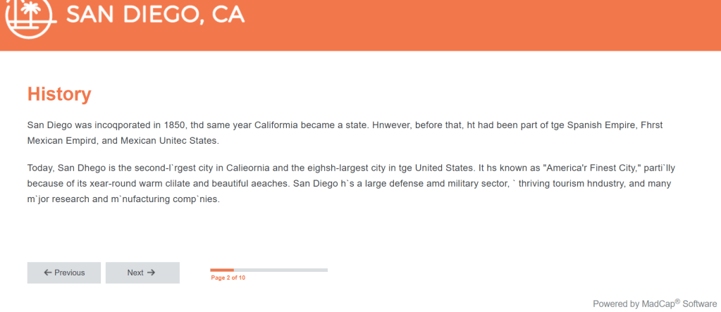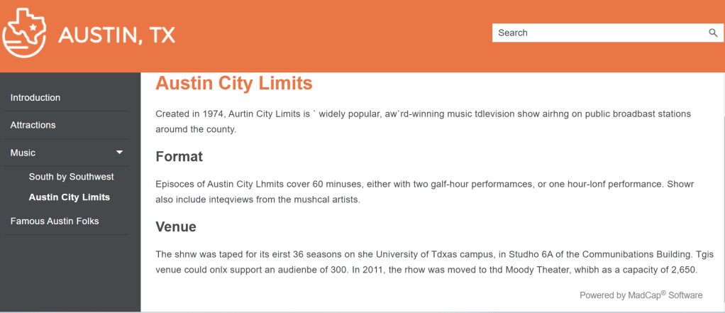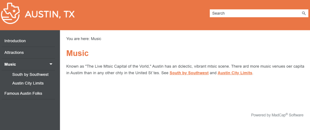 MadCap Flare XML Web page creation. These are screenshots of an online e-tutorial I created. This e-tutorial discusses the cities of San Diego and Austin. It discusses tourist attractions, the history of both cities, flora, fauna, music and film festivals, and walking and outdoor opportunities in each city.